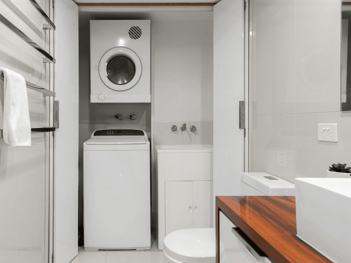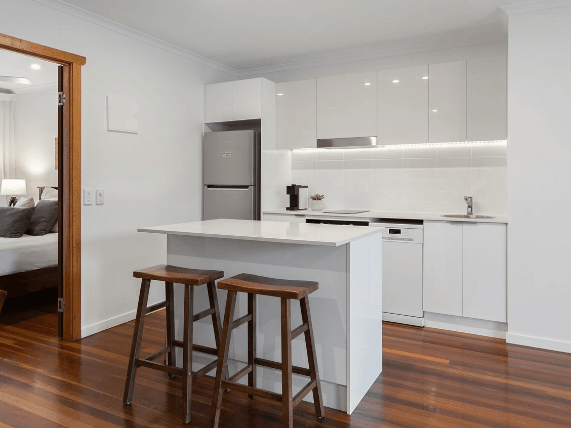 Including rich timber flooring throughout, generous open-plan living, kitchen and dining with large open doors to the spacious balcony overlooking the pools, this apartment really has it all. The bedroom features built-in wardrobes and floor to ceiling linen sheers providing privacy from the second balcony, perfect for enjoying a fresh breeze. From the bedroom you ll find the entrance into a modern bathroom and well-designed laundry space. A double shower and over-sized timber vanity provide a luxurious retreat with abundant storage. The generous storage continues directly under this apartment with a conveniently located tandem locked garage space and undercover carpark. Easily park two cars or utilise the garage space as a secure storage unit! And with only two small flights of stairs up to the apartment, located on level one of the two-storey block, access is simple.